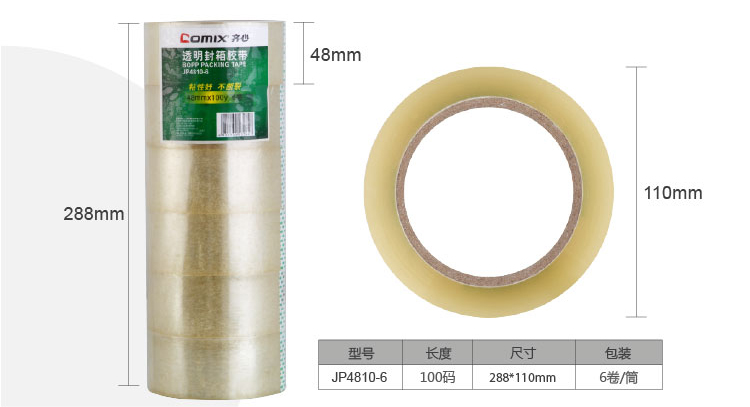 齐心/Comix JP4810-6 48mm*100y 普透封箱胶带 透明 6卷/筒