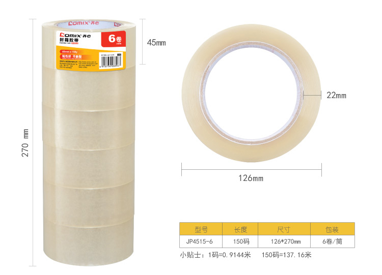 齐心/Comix JP4515-6 45mm*150y 封箱胶带 透明 6卷/筒